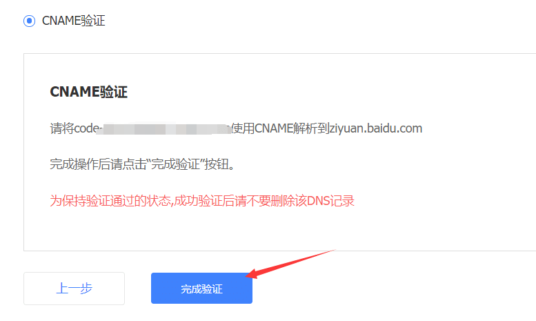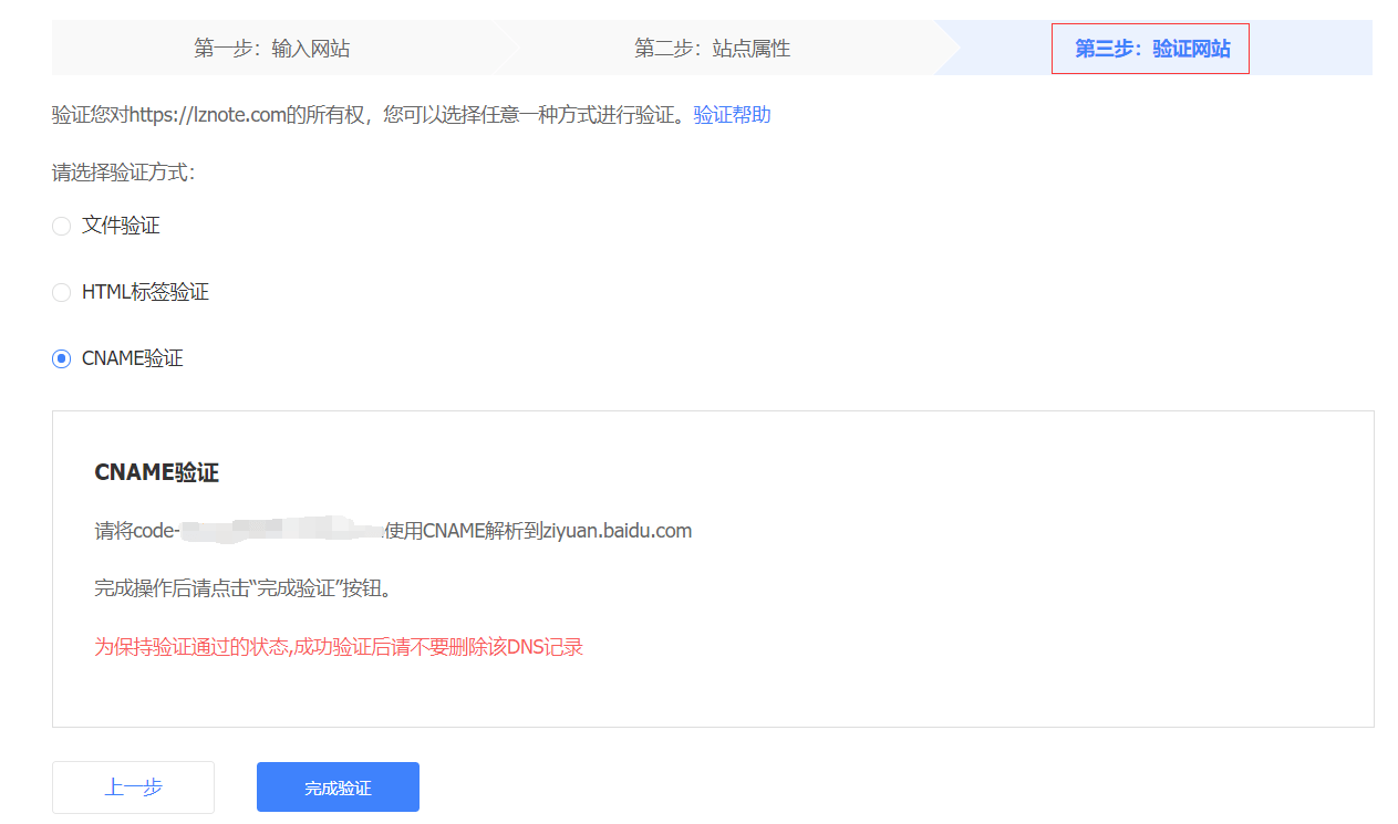 4.到了第三步的时候,验证你的网站信息,前去域名 DNS 添加一个 CNAME 记录即可完成验证