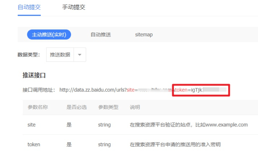 其中的 token 可以在【链接提交】-【自动提交】-【主动推送】下面看到,接口调用地址最后面 token=xxxxx 即为你的 token