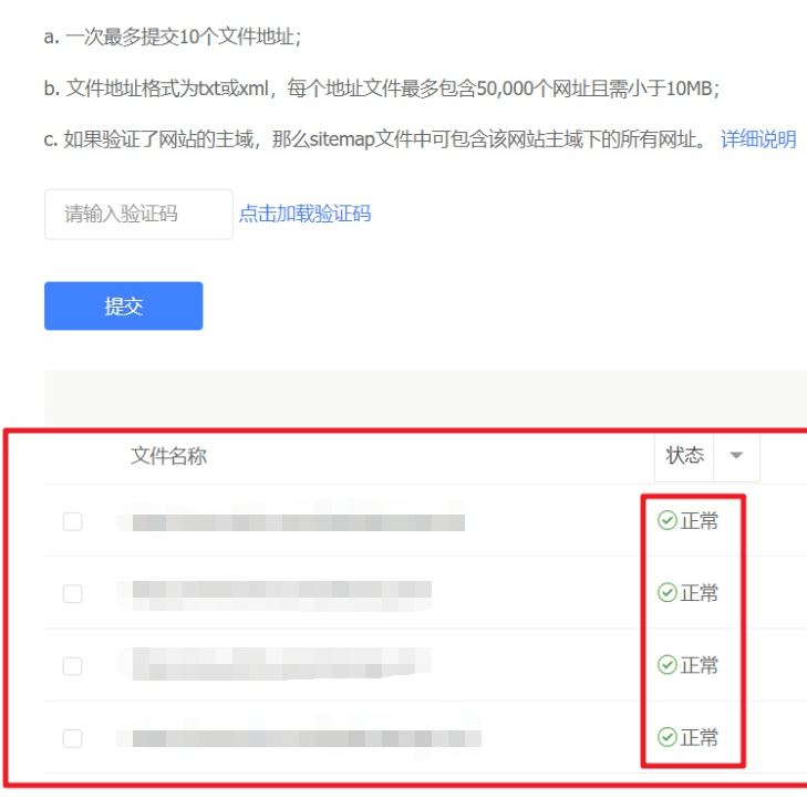 5.然后来到百度站长平台的 sitemap 提交页面,将你的 sitemap 地址提交即可,如果成功的话状态会显示为正常,初次提交要等几分钟,sitemap.xml 相比 baidusitemap.xml 来说等待时间也会更长,如果以后你博客有新的文章或其他页面,可以点击手动更新文件,更新一下新的 sitemap