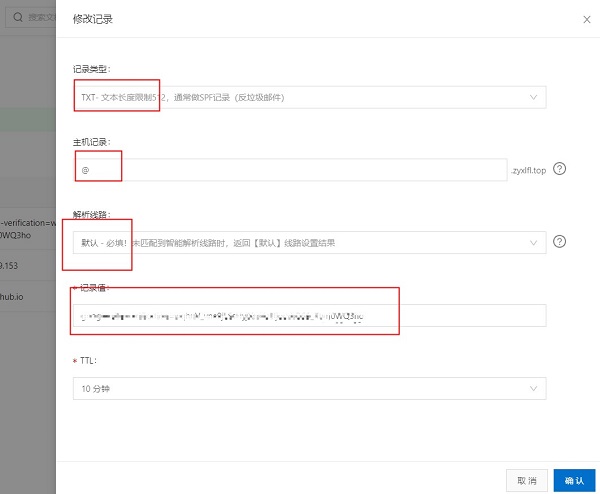 4.前往域名控制台域名解析处配置,将TXT值复制到记录值处