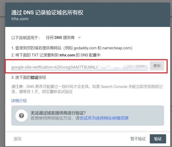3.确定之后会给你一个 TXT 的记录值,复制它到你域名 DNS 增加一个 TXT 记录,点击验证即可